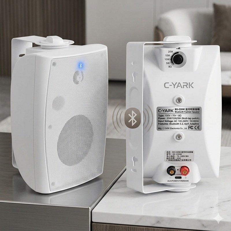 The C-YARK BS-220W Bluetooth Fashion Speaker is a stylish wall-mount speaker designed for modern homes, cafés, boutiques, and offices that require both attractive design and high-quality audio performance. With its built-in amplifier and Bluetooth connectivity, the speaker allows users to stream music wirelessly from smartphones without needing an external amplifier.